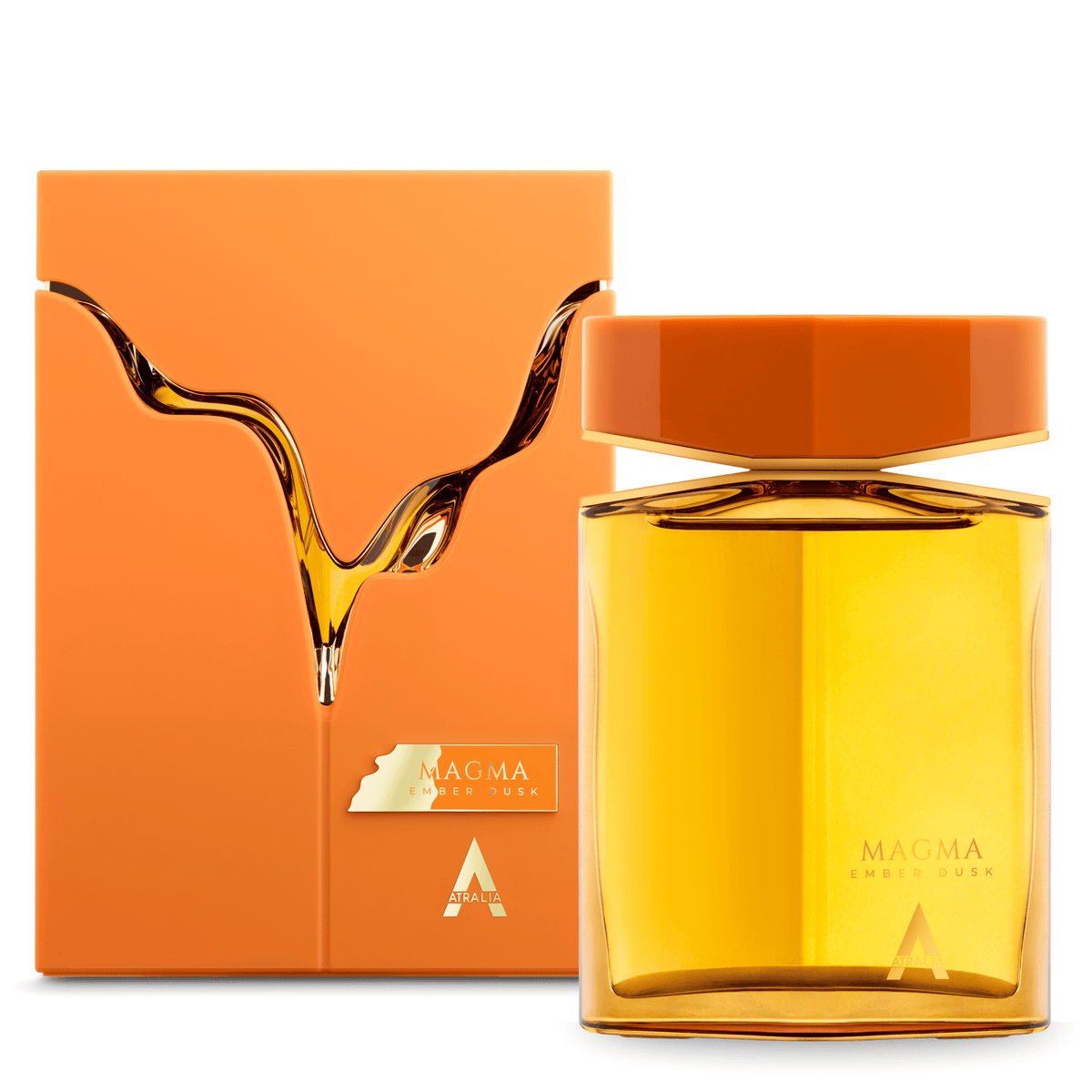 Atralia Magma Ember Dusk is a bold and magnetic scent that strikes a balance of warmth and refinement. It opens with the spiced sweetness of nutmeg, softened by orange blossom, white florals, and golden honey. At the heart, cashmere wood blends with jasmine sambac absolute, while a touch of cinnamon adds warmth and character. The fragrance settles into a base of creamy tonka bean, vanilla, and cedarwood, finished with a subtle powdery accord that lends comfort and sophistication. The result is a fragrance that feels powerful yet inviting, weaving sweetness, spice, and woods into a trail of lasting intensity.